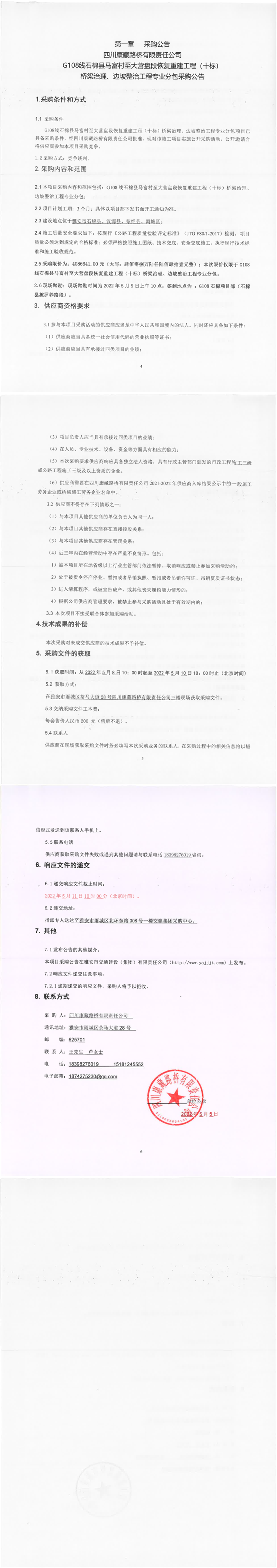 四川康藏路橋有限責(zé)任公司G108線石棉縣馬富村至大營(yíng)盤段恢復(fù)重建工程(十標(biāo))橋梁治理、邊坡整治工程專業(yè)分包采購公告