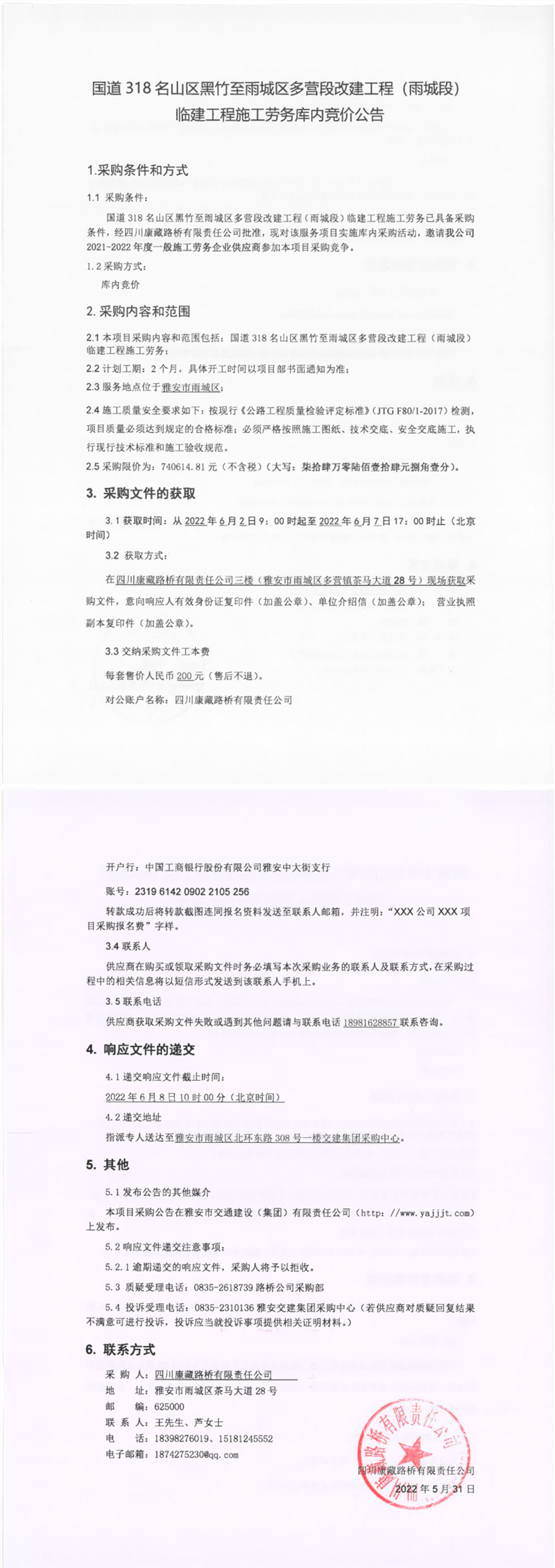 四川康藏路橋有限責任公司國道318名山區(qū)黑竹至雨城區(qū)多營段改建工程(雨城段)臨建工程施工勞務庫內競價公告