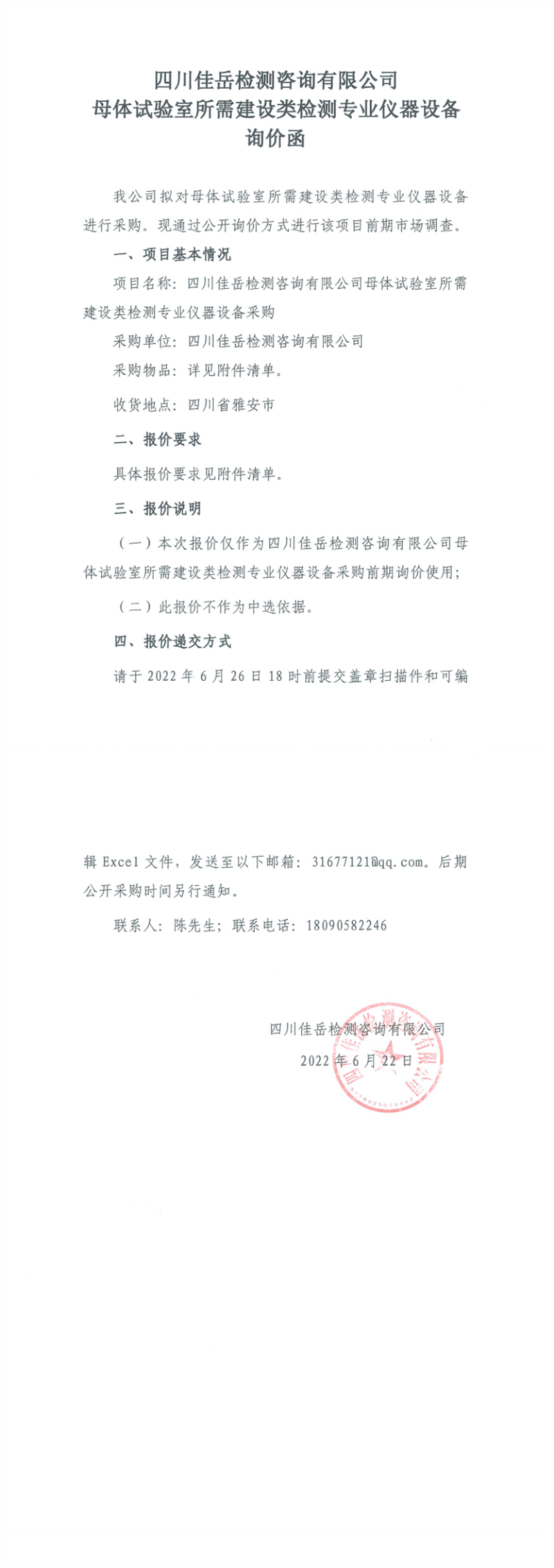 四川佳岳檢測(cè)咨詢有限公司母體試驗(yàn)室所需建設(shè)類檢測(cè)專業(yè)儀器設(shè)備詢價(jià)函