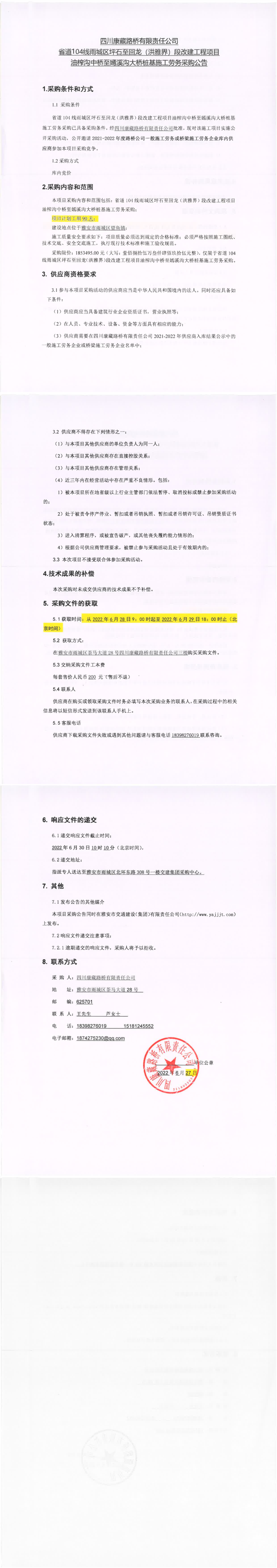 四川康藏路橋有限責任公司省道104線雨城區(qū)坪石至回龍(洪雅界)段改建工程項目錢壩大橋、望魚大橋樁基及鋼便橋工程施工勞務采購公告