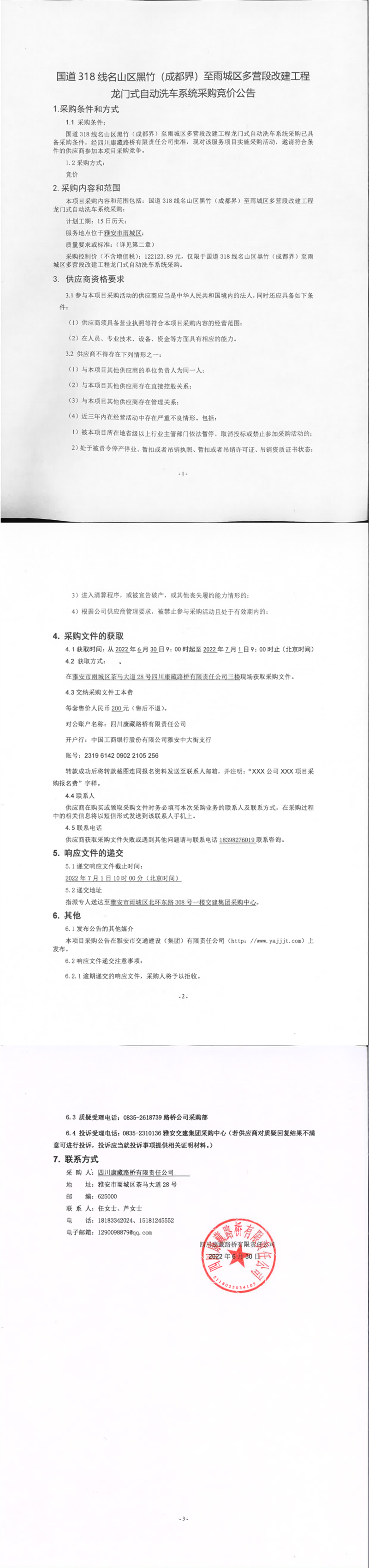 四川康藏路橋有限責(zé)任公司國道318名山區(qū)黑竹(成都界)至雨城區(qū)多營段改建工程龍門式自動(dòng)洗車系統(tǒng)采購競價(jià)公告
