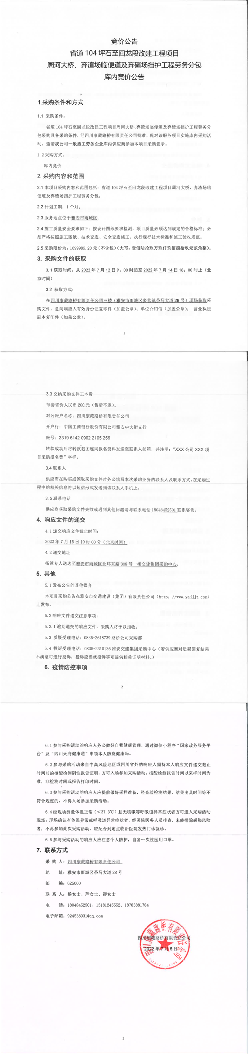 四川康藏路橋有限責(zé)任公司省道104坪石至回龍段改建工程項(xiàng)目周河大橋、棄渣場(chǎng)臨便道及棄碴場(chǎng)擋護(hù)工程勞務(wù)分包庫內(nèi)競(jìng)價(jià)公告