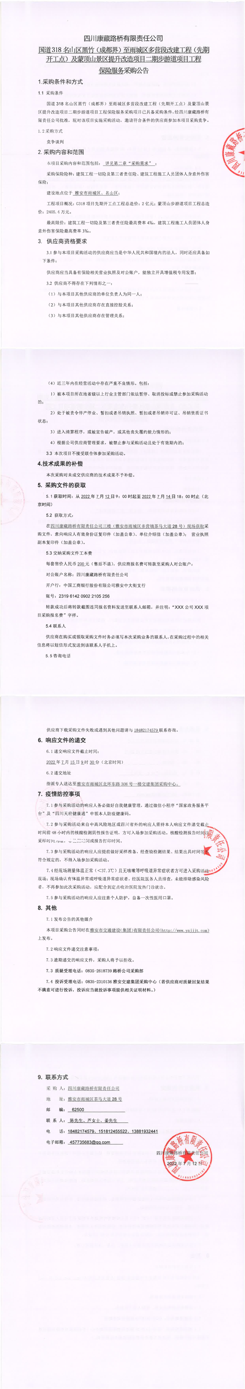 四川康藏路橋有限責(zé)任公司國(guó)道318名山區(qū)黑竹(成都界)至雨城區(qū)多營(yíng)段改建工程(先期開工點(diǎn))及蒙頂山景區(qū)提升改造項(xiàng)目二期步游道項(xiàng)目工程保險(xiǎn)服務(wù)采購(gòu)公告