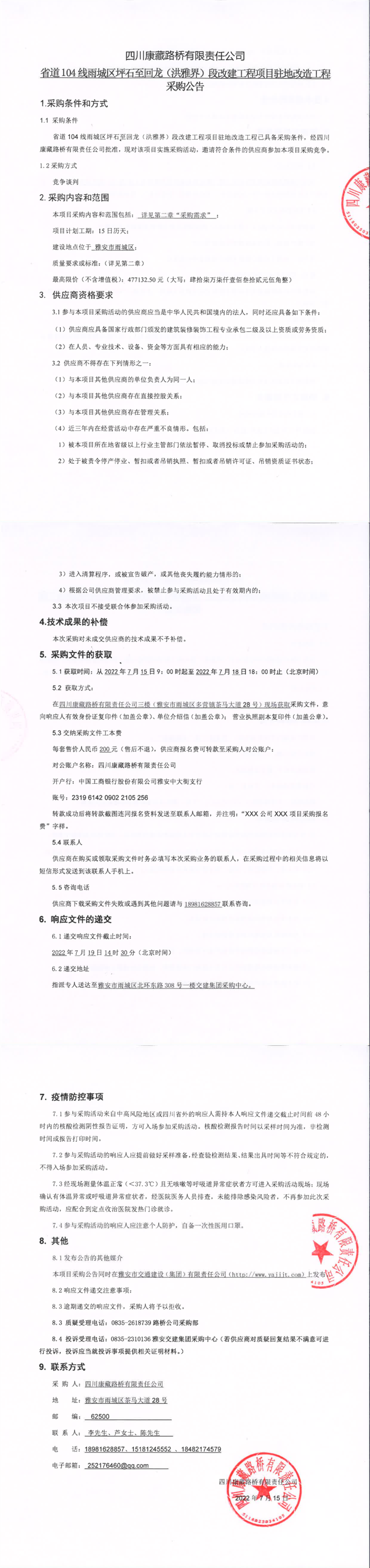 四川康藏路橋有限責(zé)任公司省道104線雨城區(qū)坪石至回龍(洪雅界)段改建工程項(xiàng)目駐地改造工程采購(gòu)公告