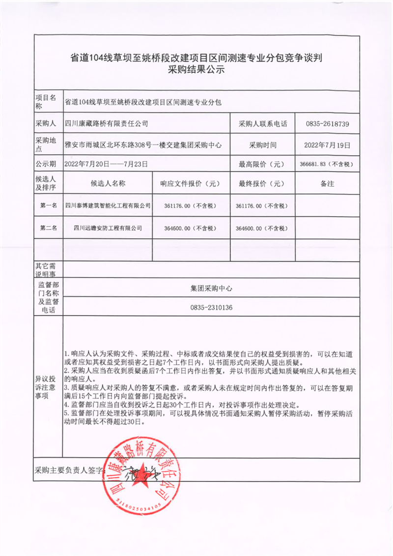 四川康藏路橋有限責任公司省道104線草壩至姚橋段改建項目區(qū)間測速專業(yè)分包競爭談判采購結果公示