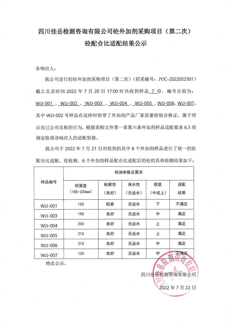 四川佳岳檢測(cè)咨詢有限公司砼外加劑采購(gòu)項(xiàng)目(第二次)砼配合比適配結(jié)果公示