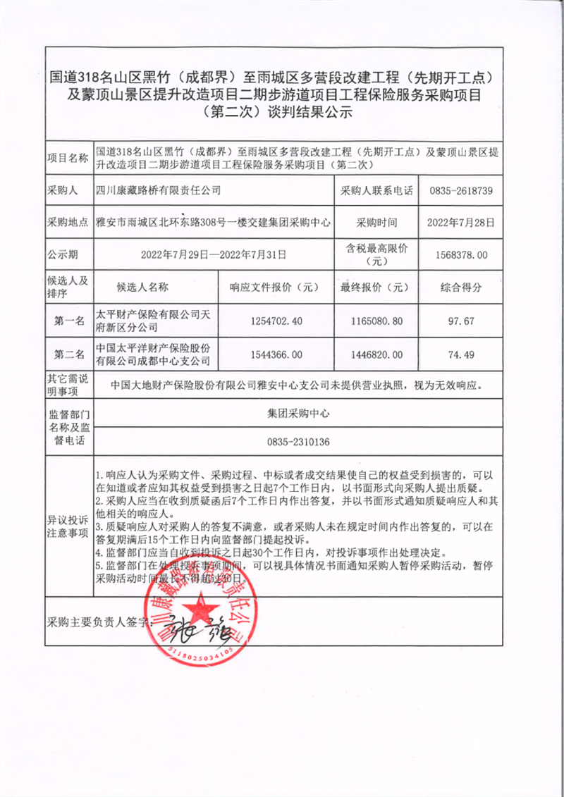 四川康藏路橋有限責(zé)任公司國道318名山區(qū)黑竹(成都界)至雨城區(qū)多營段改建工程(先期開工點(diǎn))及蒙頂山景區(qū)提升改造項(xiàng)目二期步游道項(xiàng)目工程保險(xiǎn)服務(wù)采購項(xiàng)目(第二次)談判結(jié)果公示
