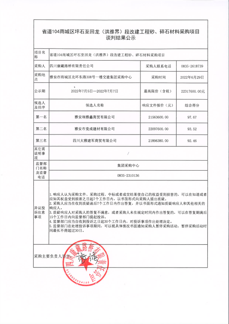四川康藏路橋有限責任公司省道104雨城區(qū)坪石至回龍(洪雅界)段改建工程砂、碎石材料采購項目談判結(jié)果公示