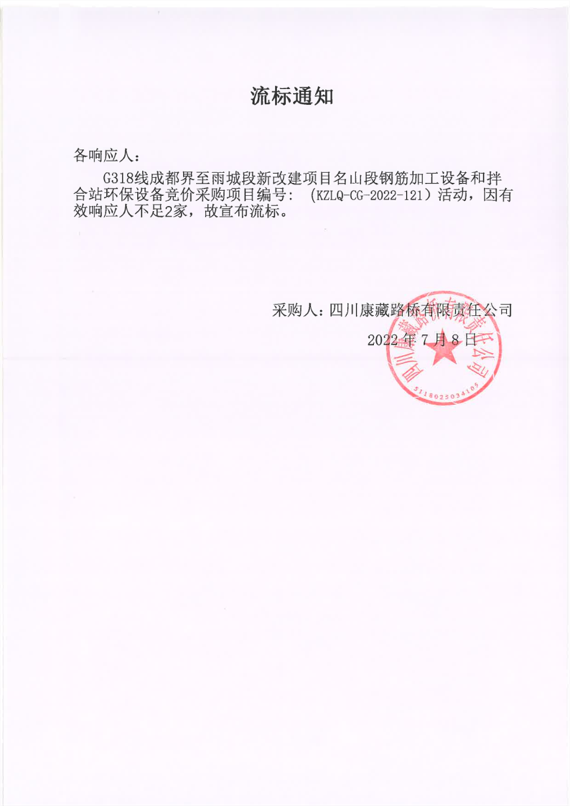 四川康藏路橋有限責任公司G318線成都界至雨城段新改建項目名山段鋼筋加工設(shè)備和拌合站環(huán)保設(shè)備競價采購項目流標通知