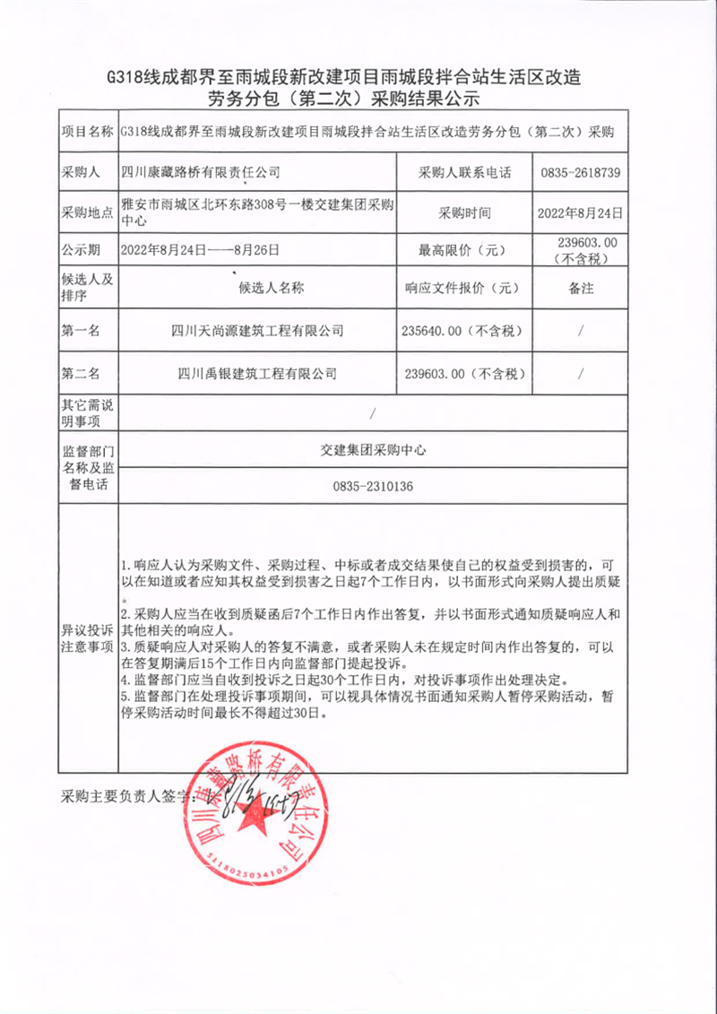 四川康藏路橋有限責(zé)任公司G318線成都界至雨城段新改建項目雨城段拌合站生活區(qū)改造勞務(wù)分包(第二次)采購結(jié)果公示