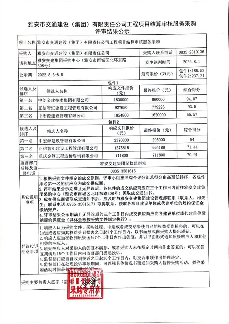 雅安市交通建設(shè)(集團(tuán))有限責(zé)任公司工程項(xiàng)目結(jié)算審核服務(wù)采購(gòu)評(píng)審結(jié)果公示