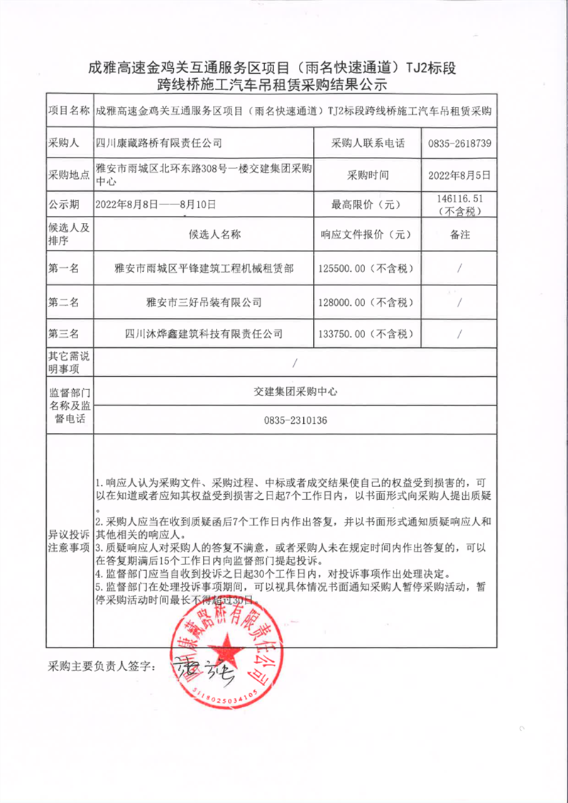 四川康藏路橋有限責(zé)任公司成雅高速金雞關(guān)互通服務(wù)區(qū)項(xiàng)目(雨名快速通道)TJ2標(biāo)段跨線橋施工汽車吊租賃采購結(jié)果公示