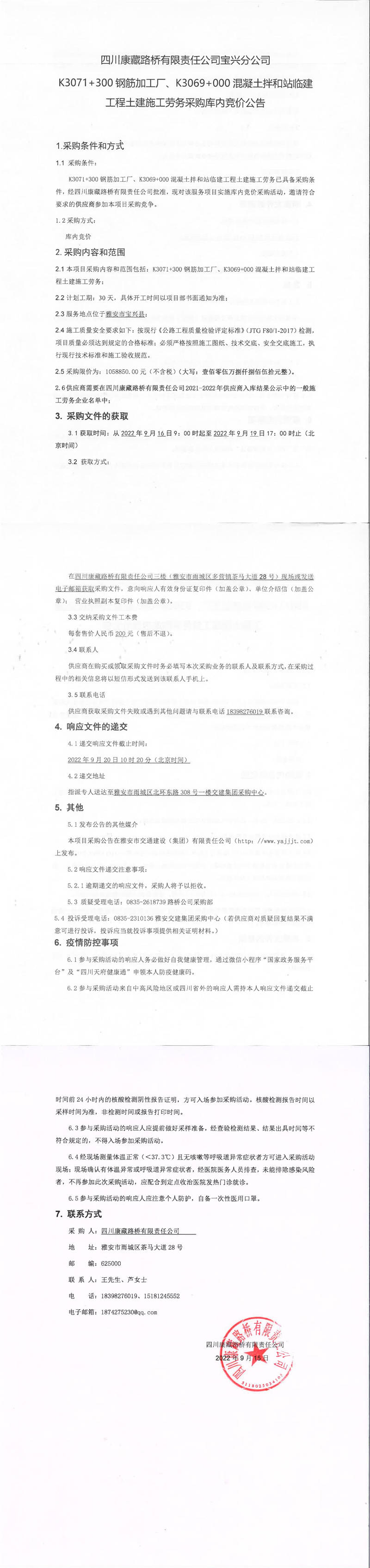 四川康藏路橋有限責(zé)任公司寶興分公司K3071+300鋼筋加工廠、K3069+000混凝土拌和站臨建工程土建施工勞務(wù)采購庫內(nèi)競價(jià)公告