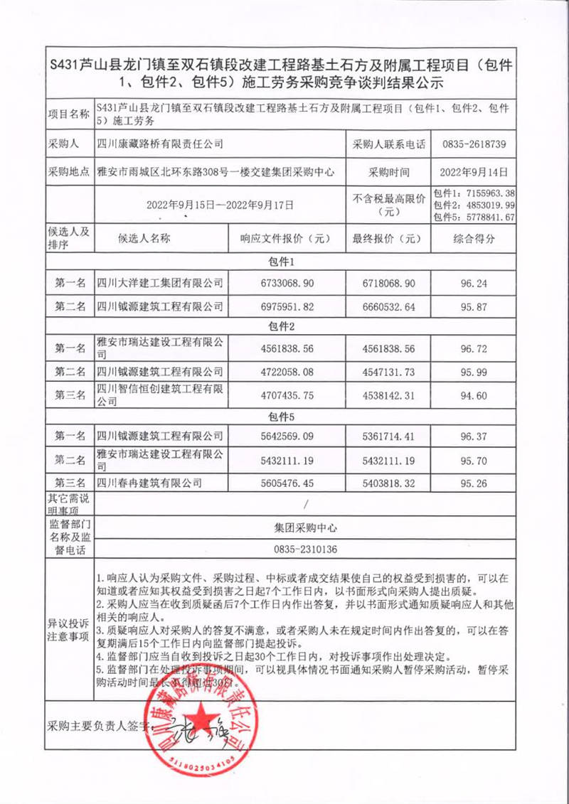 四川康藏路橋有限責(zé)任公司S431蘆山縣龍門鎮(zhèn)至雙石鎮(zhèn)段改建工程路基土石方及附屬工程項目(包件1、包件2、包件5)施工勞務(wù)采購競爭談判結(jié)果公示