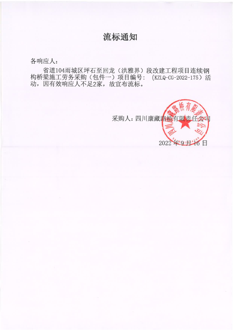 四川康藏路橋有限責(zé)任公司省道104雨城區(qū)坪石至回龍(洪雅界)段改建工程項目連續(xù)鋼構(gòu)橋梁施工勞務(wù)采購(包件一)流標通知