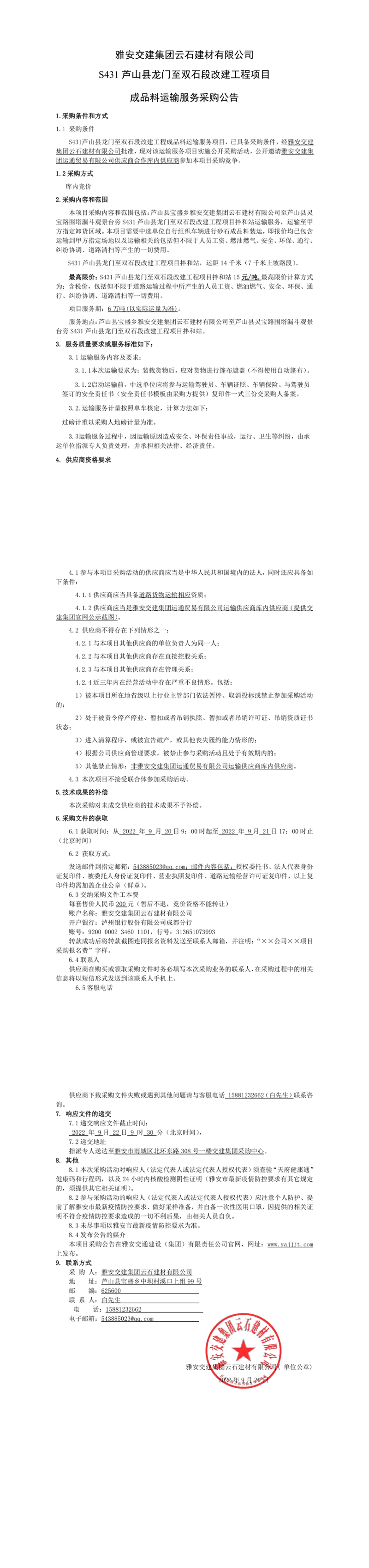 雅安交建集團云石建材有限公司S431蘆山縣龍門至雙石段改建工程項目成品料運輸服務采購公告