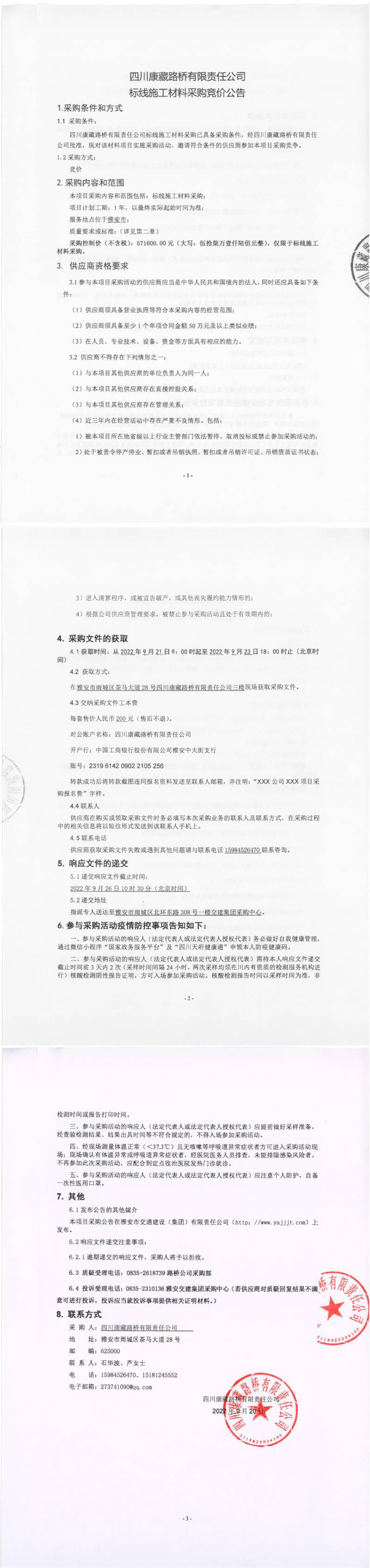 四川康藏路橋有限責(zé)任公司標(biāo)線施工材料采購競價公告