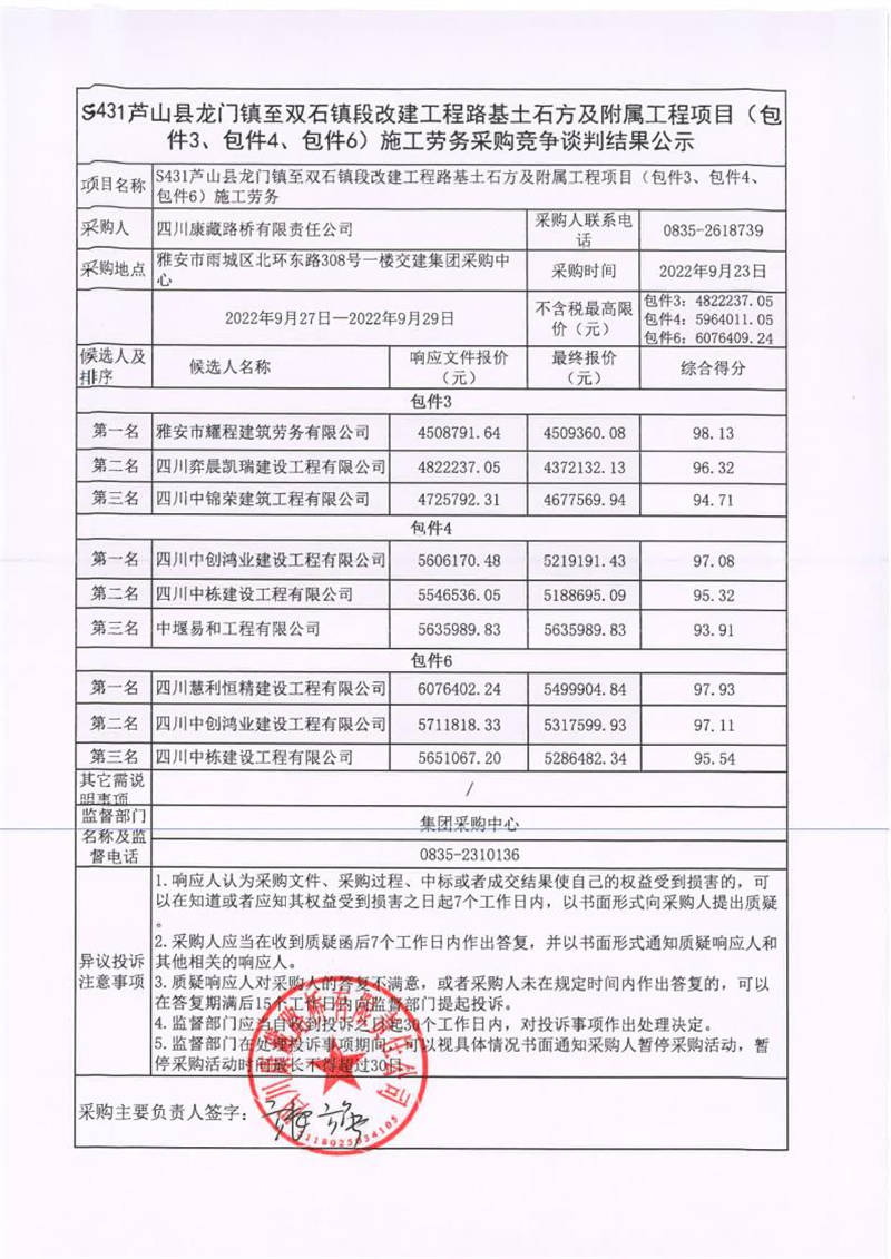 四川康藏路橋有限責任公司S431蘆山縣龍門鎮(zhèn)至雙石鎮(zhèn)段改建工程路基土石方及附屬工程項目(包件3、包件4、包件6)施工勞務(wù)采購競爭談判結(jié)果公示