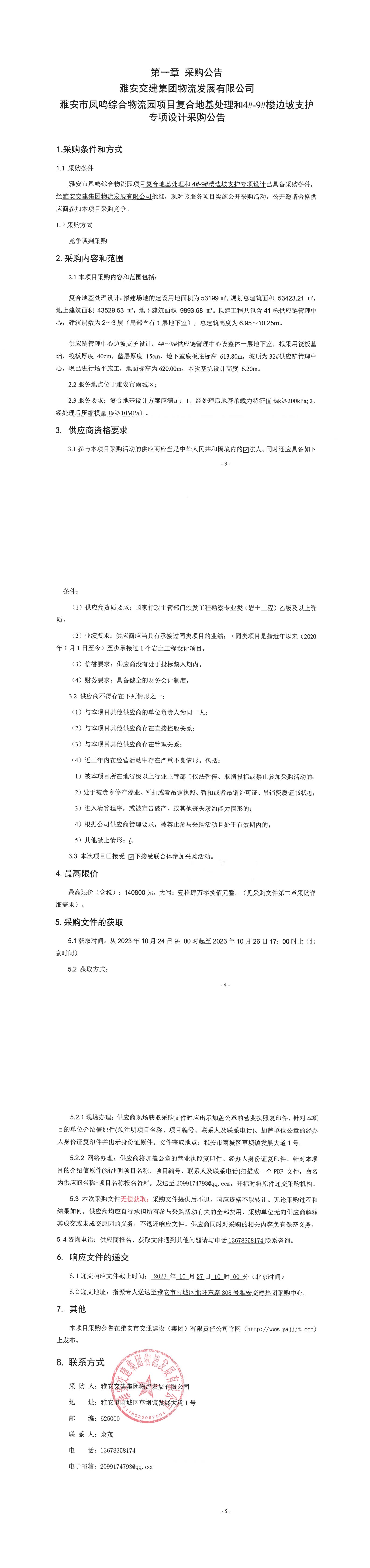 雅安交建集團物流發(fā)展有限公司雅安市鳳鳴綜合物流園項目復(fù)合地基處理和4#-9#樓邊坡支護專項設(shè)計采購公告