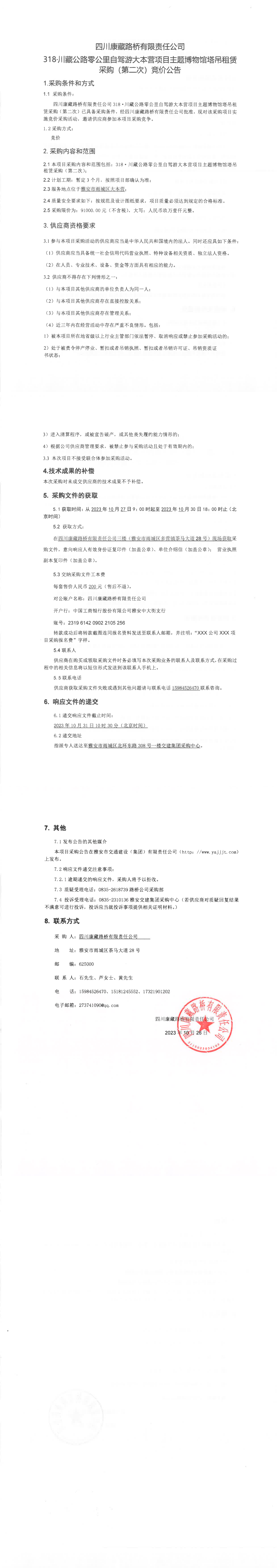 四川康藏路橋有限責(zé)任公司318·川藏公路零公里自駕游大本營項目主題博物館塔吊租賃(第二次)采購競價公告