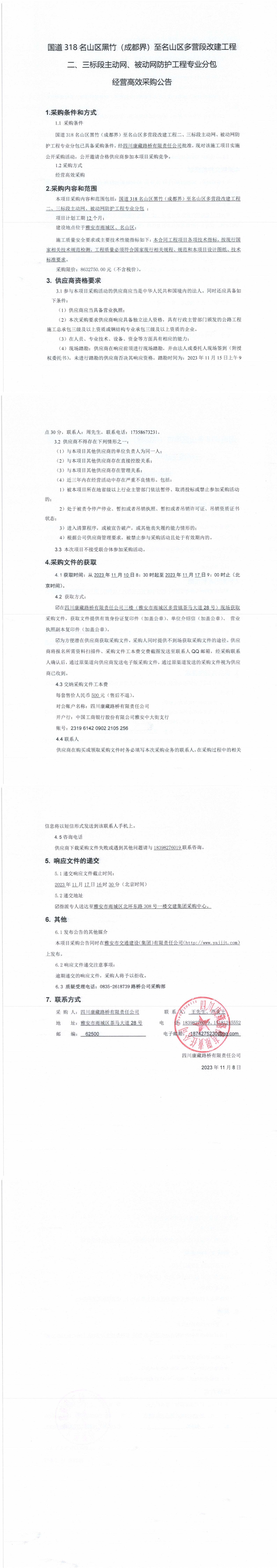 四川康藏路橋有限責(zé)任公司國道318名山區(qū)黑竹(成都界)至名山區(qū)多營段改建工程二、三標(biāo)段主動網(wǎng)、被動網(wǎng)防護(hù)工程專業(yè)分包經(jīng)營高效采購公告