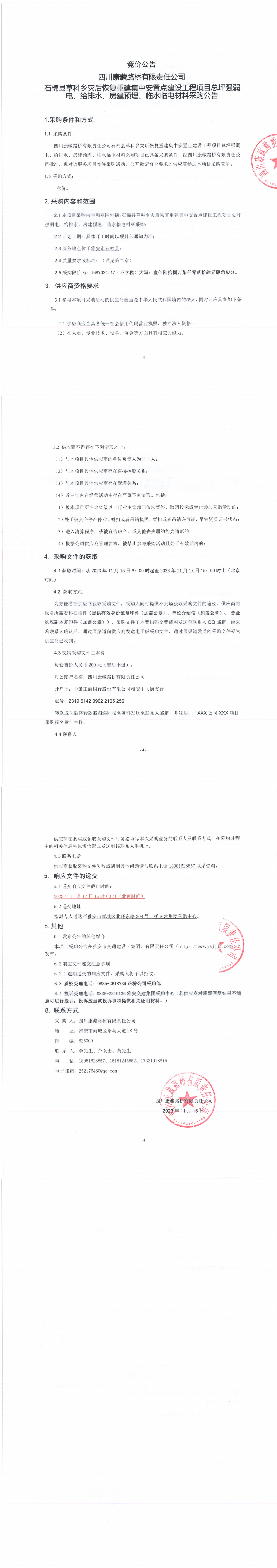 四川康藏路橋有限責任公司石棉縣草科鄉(xiāng)災(zāi)后恢復(fù)重建集中安置點建設(shè)工程項目總坪強弱電、給排水、房建預(yù)埋、臨水臨電材料采購公告