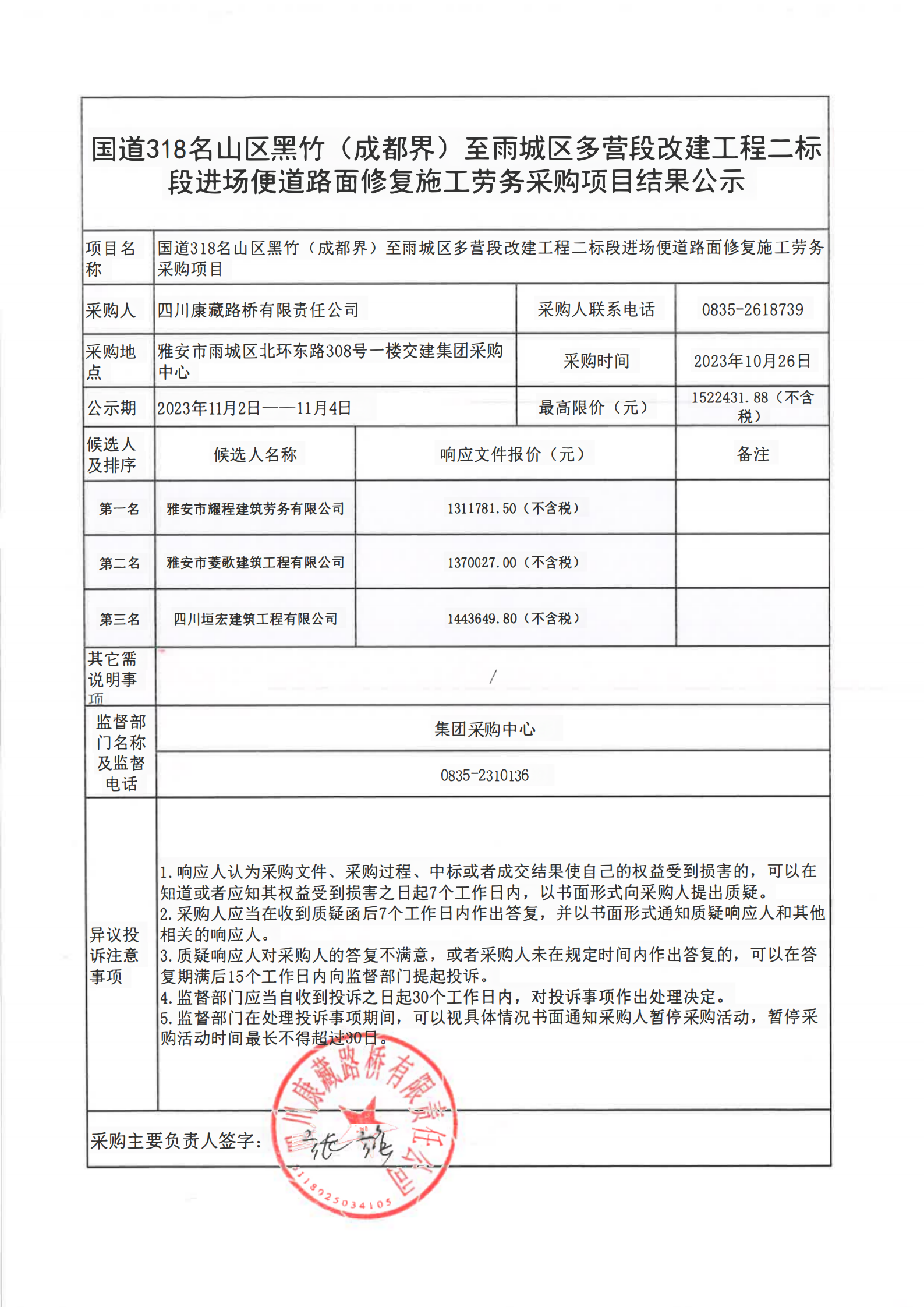 四川康藏路橋有限責任公司國道318名山區(qū)黑竹(成都界)至雨城區(qū)多營段改建工程二標段進場便道路面修復施工勞務采購項目結果公示
