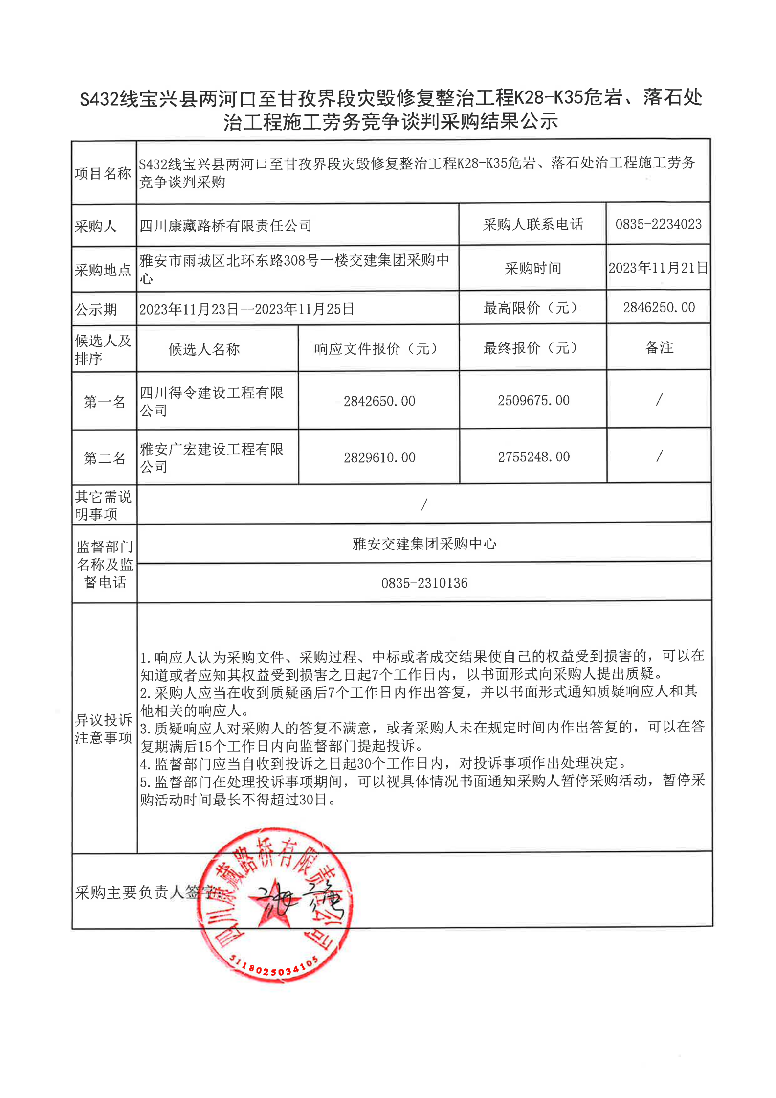 四川康藏路橋有限責任公司S432線寶興縣兩河口至甘孜界段災毀修復整治工程K28-K35危巖、落石處治工程施工勞務競爭談判采購結果公示