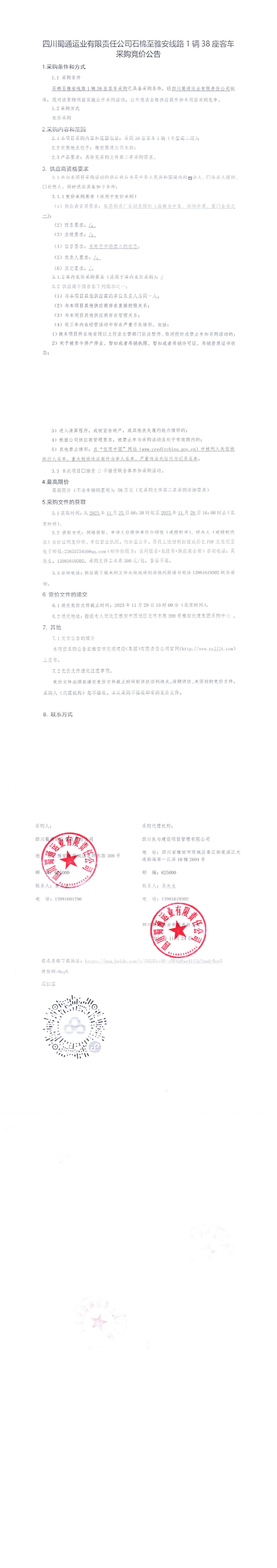 四川蜀通運業(yè)有限責(zé)任公司石棉縣至雅安線路1輛38座客車采購競價公告