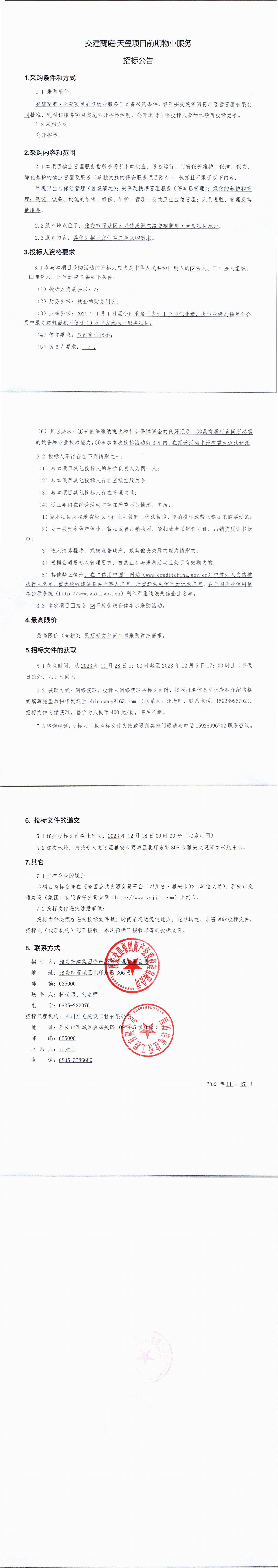 雅安交建集團資產(chǎn)經(jīng)營管理有限公司交建蘭庭·天璽項目前期物業(yè)服務招標公告