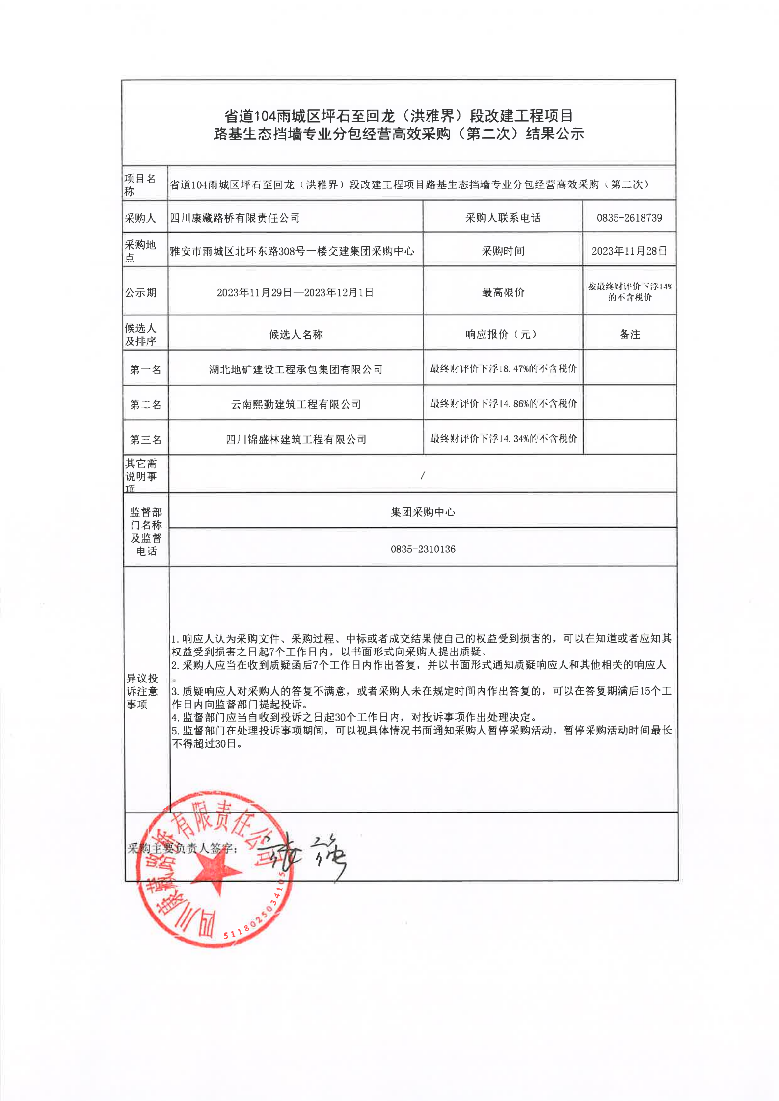 四川康藏路橋有限責(zé)任公司省道104雨城區(qū)坪石至回龍(洪雅界)段改建工程項(xiàng)目路基生態(tài)擋墻專(zhuān)業(yè)分包經(jīng)營(yíng)高效采購(gòu)(第二次)結(jié)果公示