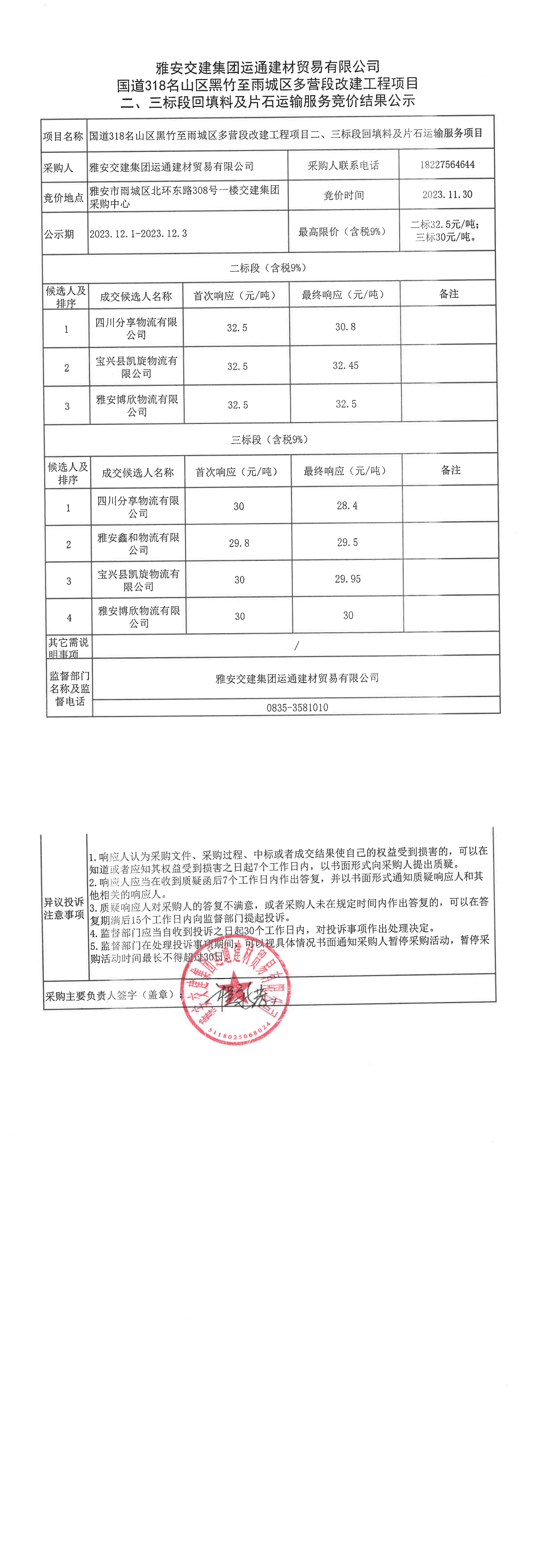 雅安交建集團運通建材貿(mào)易有限公司國道318名山區(qū)黑竹至雨城區(qū)多營段改建工程項目二、三標(biāo)段回填料、片石運輸服務(wù)競價結(jié)果公示
