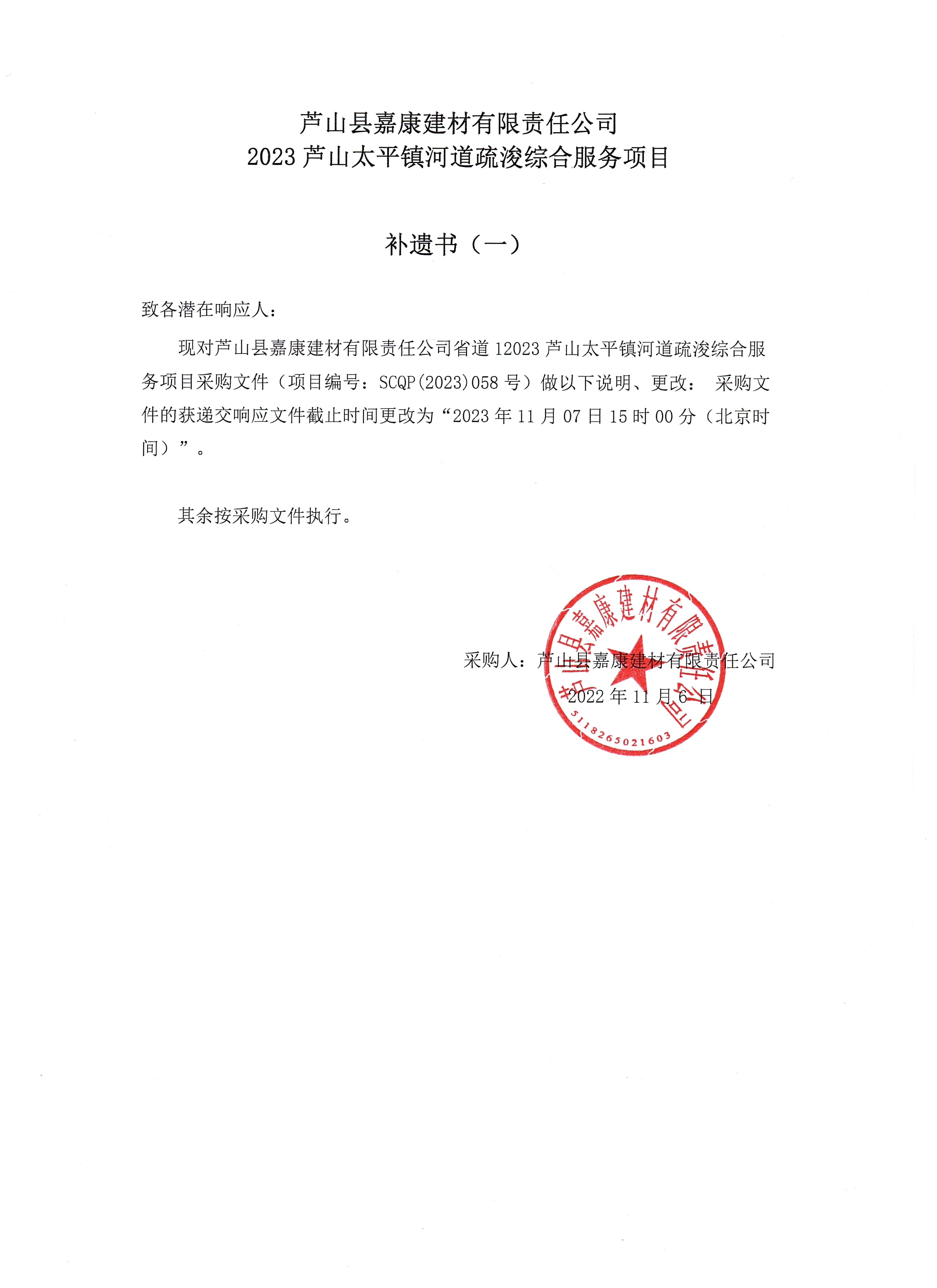 蘆山縣嘉康嘉康建材有限責(zé)任公司2023蘆山太平鎮(zhèn)河道疏浚綜合服務(wù)項(xiàng)目補(bǔ)遺書(一)