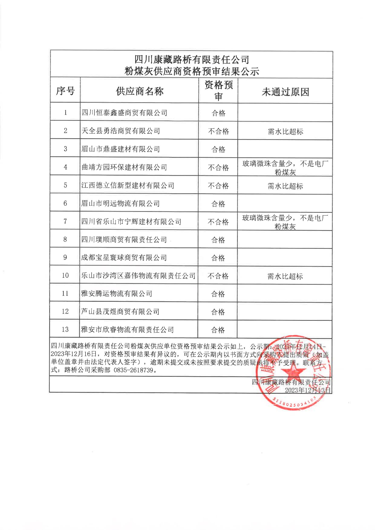 四川康藏路橋有限責任公司粉煤灰供應商資格預審結果公示