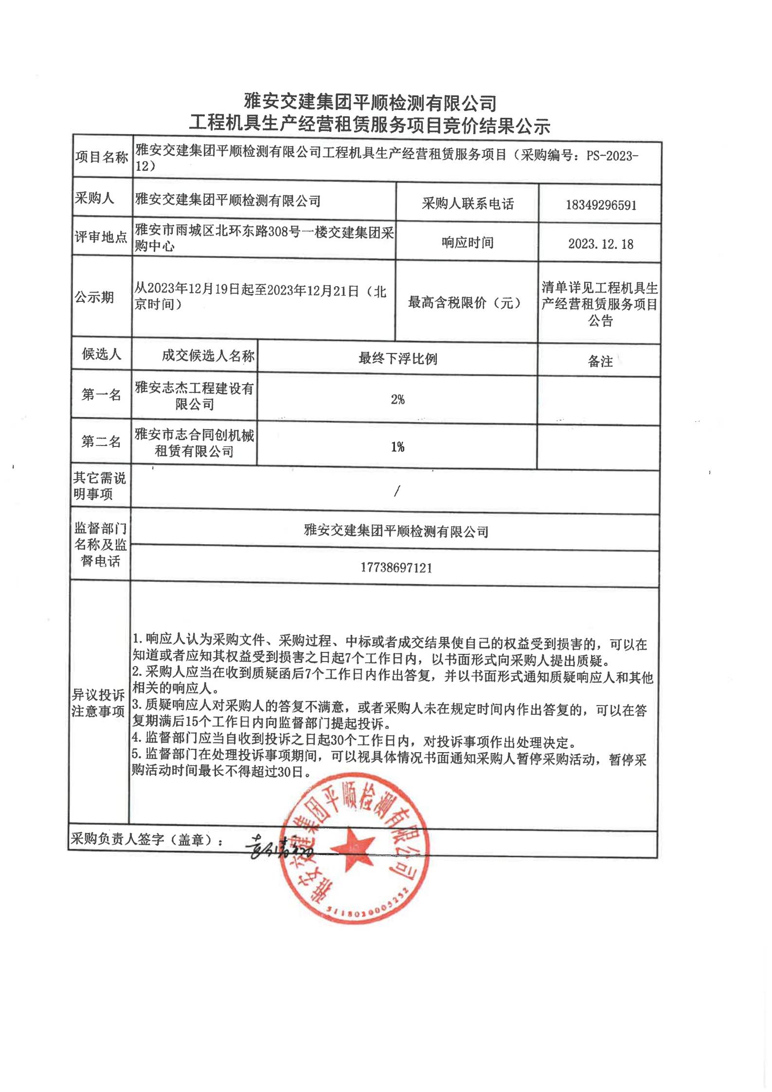 雅安交建集團平順檢測有限公司工程機具生產(chǎn)經(jīng)營租賃服務項目競價結(jié)果公示