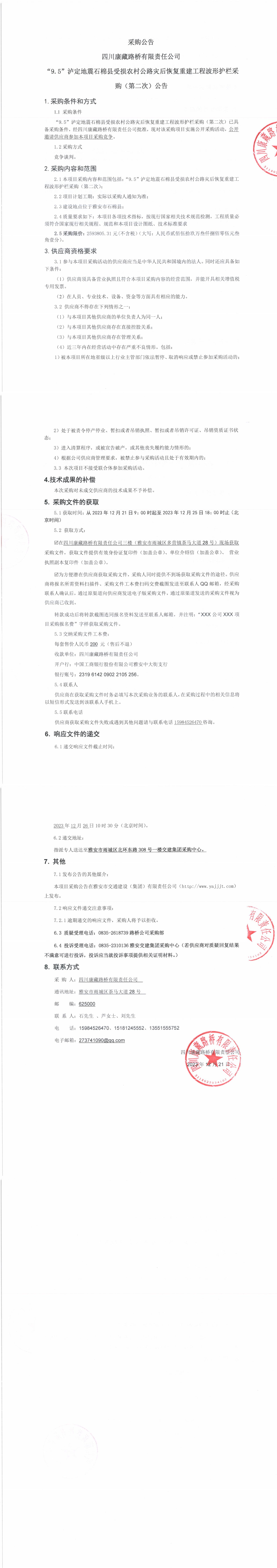 四川康藏路橋有限責(zé)任公司“9.5”瀘定地震石棉縣受損農(nóng)村公路災(zāi)后恢復(fù)重建工程波形護(hù)欄采購(第二次)公告