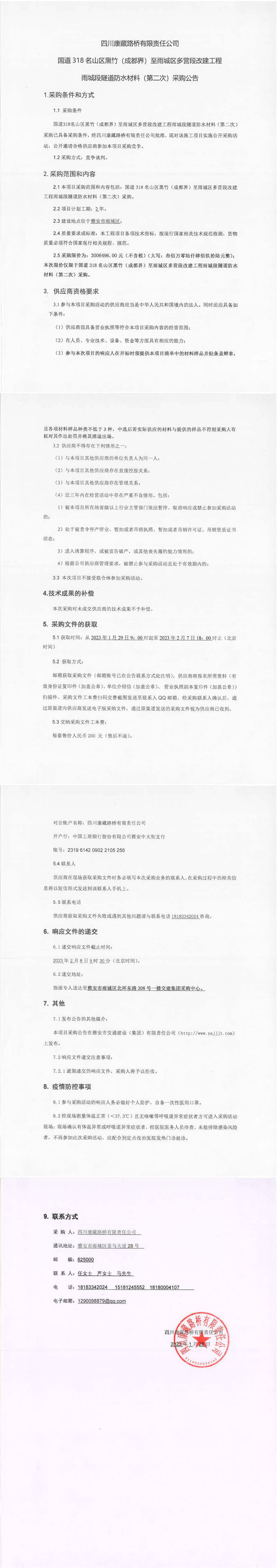 四川康藏路橋有限責任公司國道318名山區(qū)黑竹(成都界)至雨城區(qū)多營段改建工程雨城段隧道防水材料(第二次)采購公告