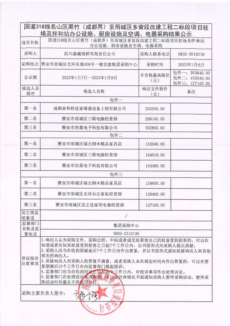 四川康藏路橋有限責(zé)任公司國(guó)道318線名山區(qū)黑竹(成都界)至雨城區(qū)多營(yíng)段改建工程二標(biāo)段項(xiàng)目駐場(chǎng)及拌和站辦公設(shè)施、廚房設(shè)施及空調(diào)、電器采購結(jié)果公示