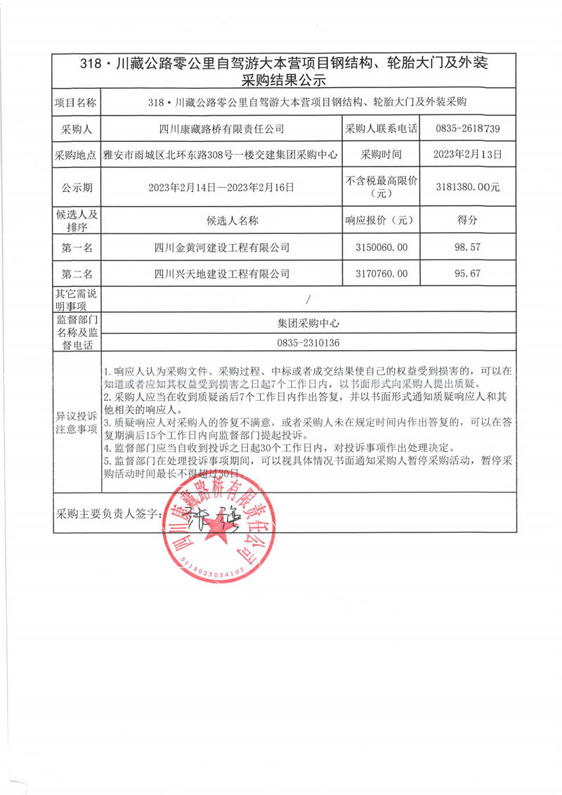 四川康藏路橋有限責任公司318.川藏公路零公里自駕游大本營項目鋼結(jié)構(gòu)、輪胎大門及外裝采購結(jié)果公示