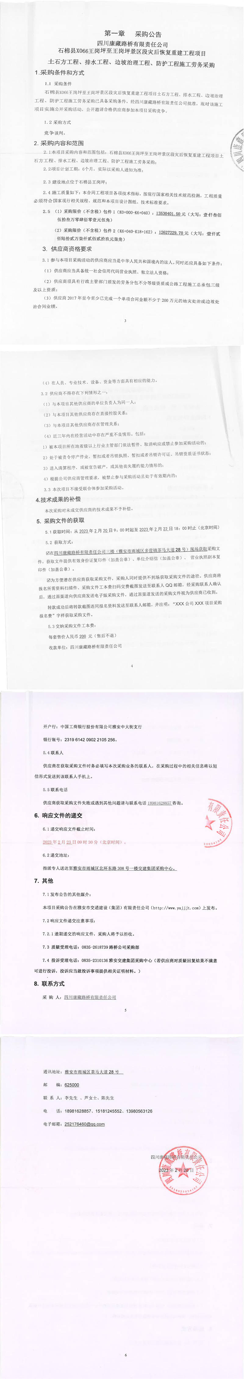 四川康藏路橋有限責(zé)任公司石棉縣X066王崗坪至王崗坪景區(qū)段災(zāi)后恢復(fù)重建工程項(xiàng)目土石方工程、排水工程、邊坡治理工程、防護(hù)工程施工勞務(wù)采購公告