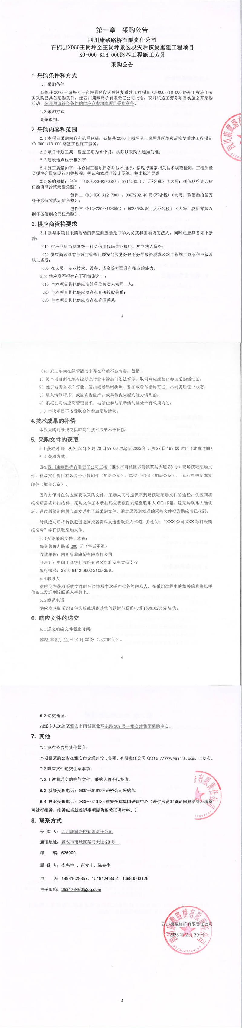 四川康藏路橋有限責任公司石棉縣X066王崗坪至王崗坪景區(qū)段災后恢復重建工程項目K0+000-K18+000路基工程施工勞務(wù)采購公告