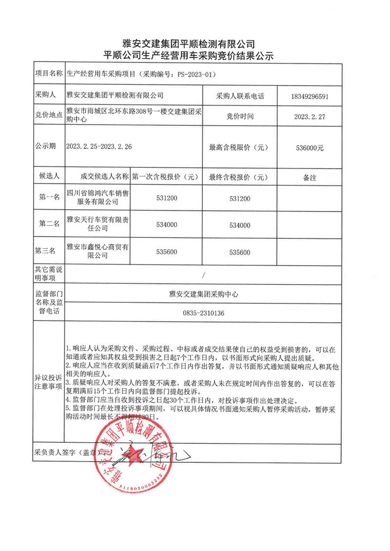 雅安交建集團平順檢測有限公司平順公司生產經營用車采購競價結果公示