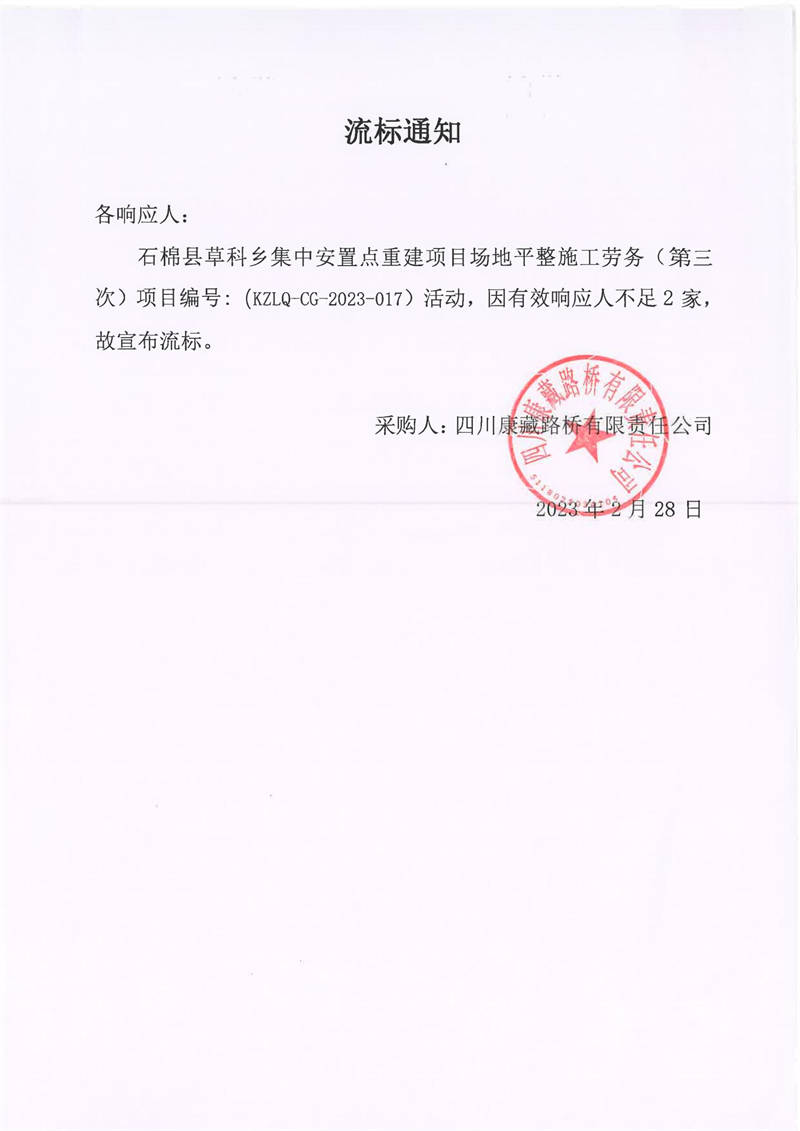 四川康藏路橋有限責(zé)任公司石棉草科鄉(xiāng)集中安置點(diǎn)重建項(xiàng)目場(chǎng)地平整施工勞務(wù)(第三次)庫(kù)內(nèi)競(jìng)價(jià)流標(biāo)通知