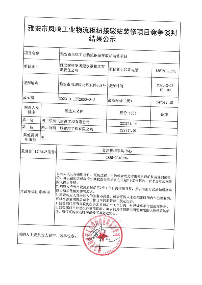 雅安交建集團無水港物流有限責(zé)任公司雅安市鳳鳴工業(yè)物流樞紐接駁站裝修項目競爭談判結(jié)果公示