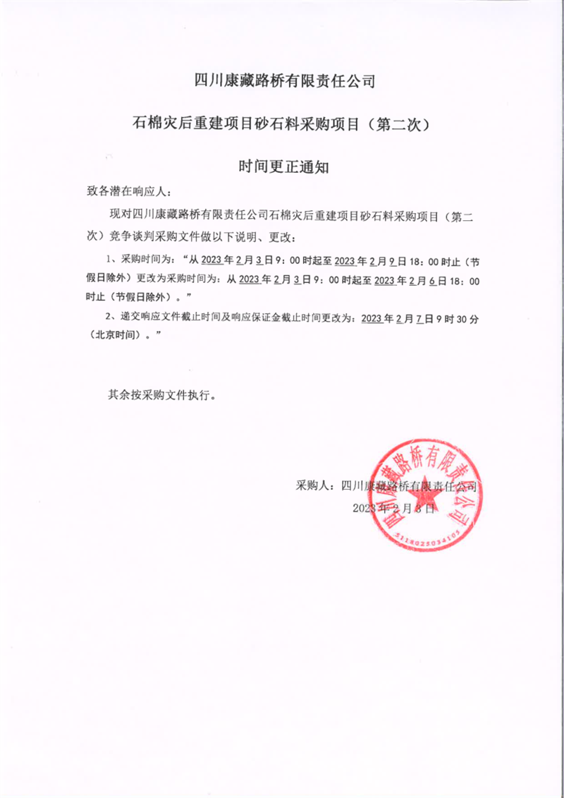四川康藏路橋有限責任公司石棉災后重建項目砂石料采購項目(第二次)時間更正通知