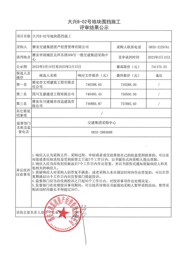 雅安交建集團(tuán)資產(chǎn)經(jīng)營(yíng)管理有限公司大興8-02號(hào)地塊圍擋施工結(jié)果公示