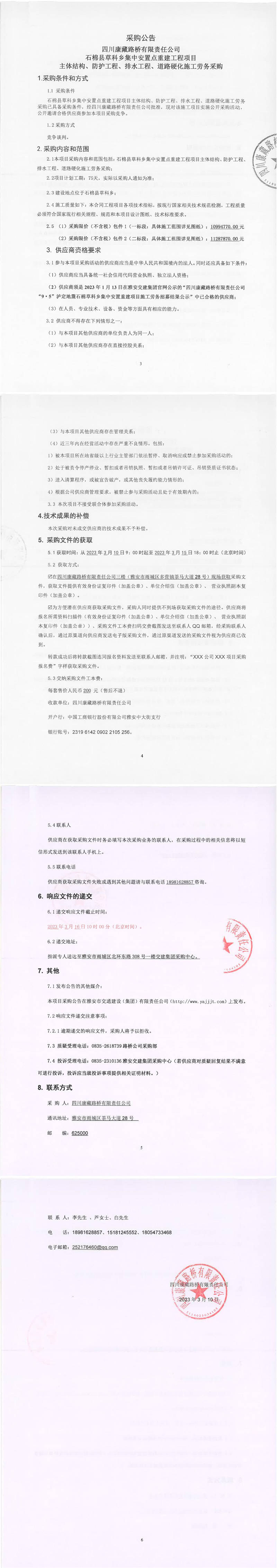 四川康藏路橋有限責(zé)任公司石棉縣草科鄉(xiāng)集中安置點重建工程項目主體結(jié)構(gòu)、防護(hù)工程、排水工程、道路硬化施工采購公告