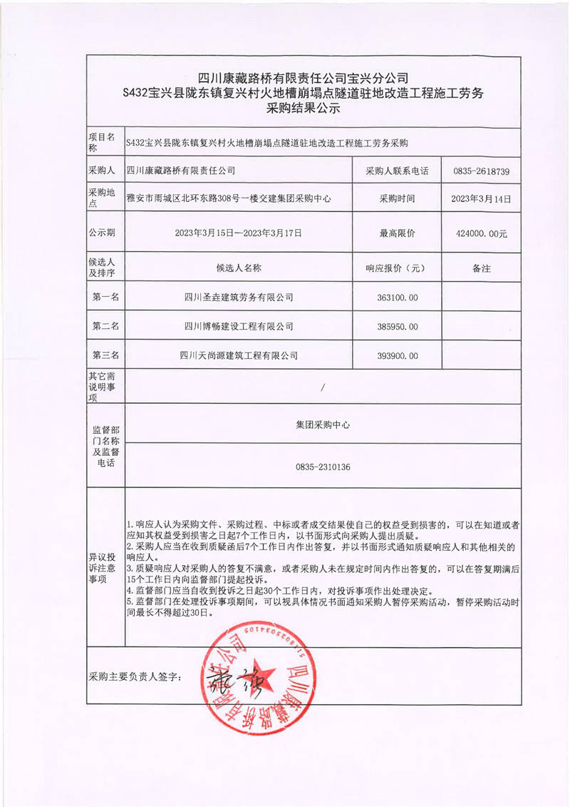 四川康藏路橋有限責(zé)任公司寶興分公司S432寶興縣隴東鎮(zhèn)復(fù)興村火地槽崩塌點(diǎn)隧道駐地改造工程施工勞務(wù)采購結(jié)果公示
