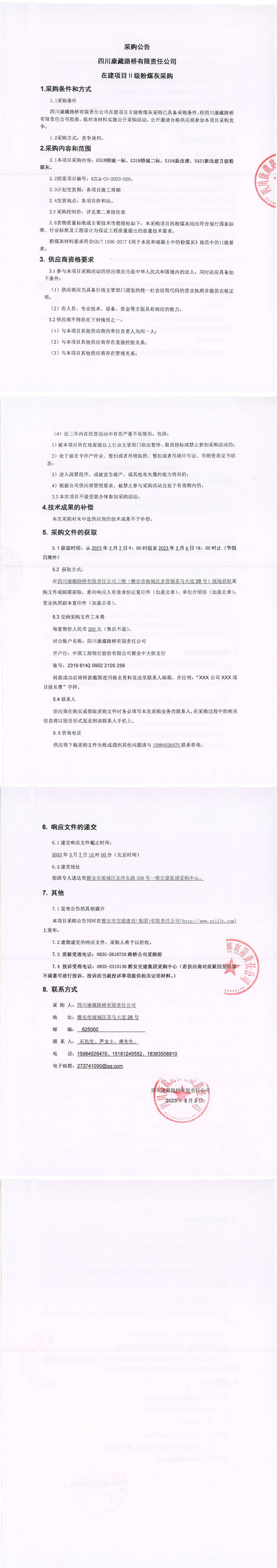 四川康藏路橋有限責(zé)任公司在建項目Ⅱ級粉煤灰采購公告