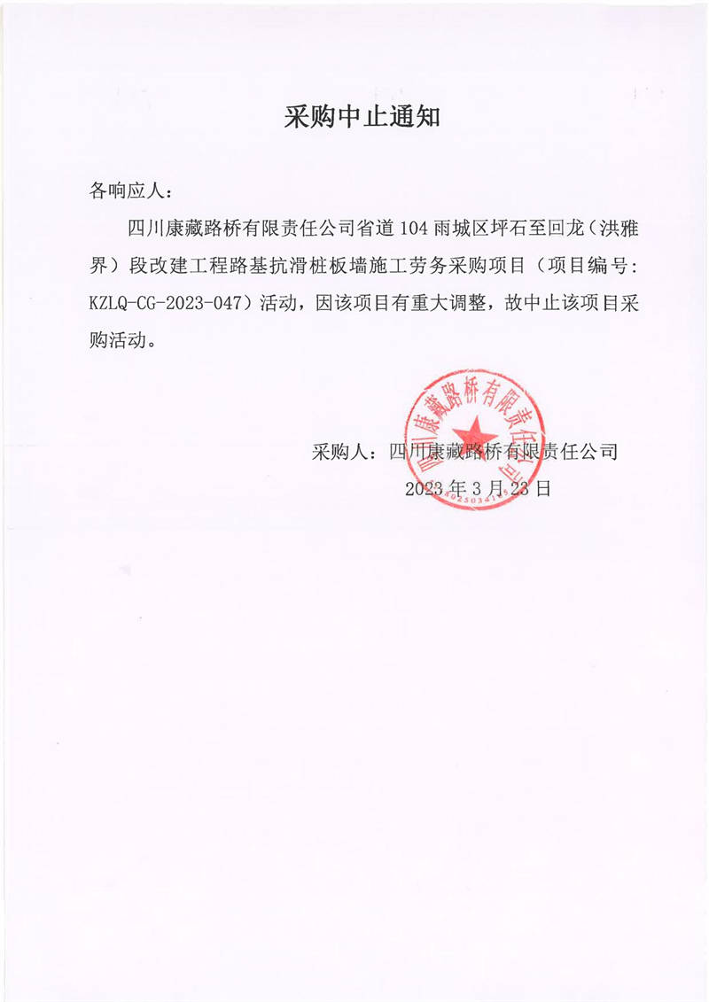 四川康藏路橋有限責任公司省道104雨城區(qū)坪石至回龍(洪雅界)段改建工程路基抗滑樁版墻施工勞務采購終止通知